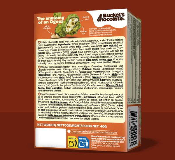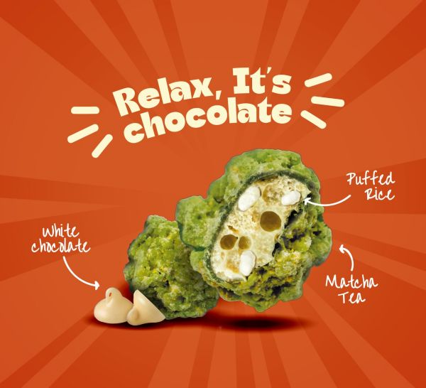 Ingredienti Principali Cioccolato Bianco, Riso Soffiato, Crumble Speculoos, Tè Matcha/Clorella